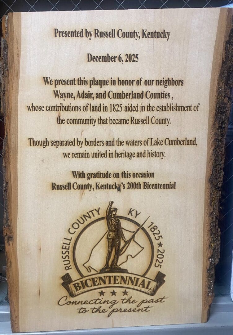 Adair County Deputy Judge Executive Bridget Compton represented Adair County at the celebration and accepted a plaque recognizing Adair County’s historic donation of land in 1825. That contribution, along with land from Wayne and Cumberland counties, helped establish the community that is now known as Russell County.