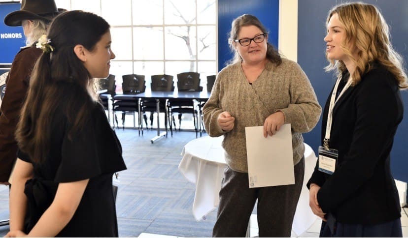 Shelby County (Kentucky) High School senior Laura Lauer, left, learns about Lindsey Wilson University’s choral program during the school’s John B. Begley Scholars Day on Saturday, Feb. 7, at an academic forum in the Robert D. Cranmer Dining & Conference Center. Speaking to Lauer are Lindsey Wilson Director of Choral Activities Jennifer Bersaglia, center, and Begley Scholar Anna Kate Alexander ’29 of Glasgow, Kentucky, who is a Begley Scholar and a member of the Lindsey Wilson Singers.