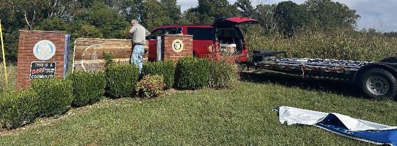 Street Department Employee Jackie Chapman removing the old welcome sign to make way for the new one.