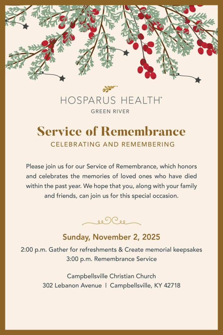 The Service of Remembrance will be held Sunday, November 2nd at Campbellsville Christian Church, located at 302 Lebanon Avenue in Campbellsville.