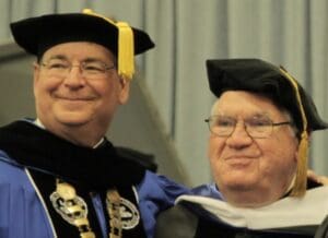 Former Lindsey Wilson University Director of Library Services Phil Hanna, right, pictured with Lindsey Wilson President William T. Luckey Jr. in 2017. Hanna was involved with the Lindsey Wilson Cultural Affairs Series from 1996 until his retirement in 2017, serving as the series chair for all but four of those years. The university has renamed the series the Phil Hanna Cultural Affairs Series.