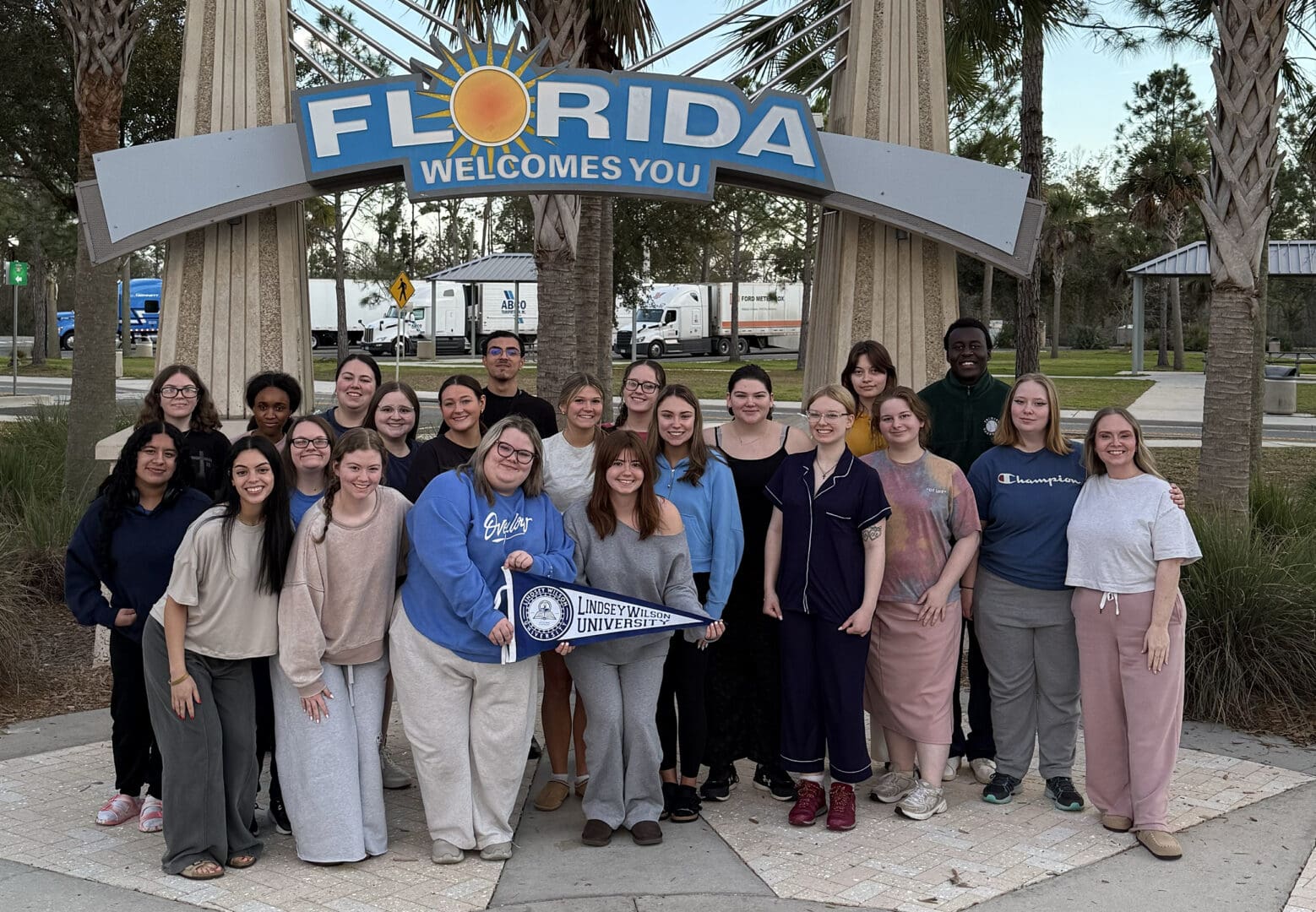Lindsey Wilson University Bonners arrive in Florida for their annual spring service trip. Pictured, alphabetically, are students: Sabrina Anderson of Burkesville, KY; Patience Anderson of Bowling Green, KY; Micaela Bailey of Campbellsville, KY; Adelyn Bennett of Columbia; Anahi Centeno-Mendoza of Russell Springs, KY; Gabrielle Crawford of Marrowbone, KY; Deborah Seth-Osehahumen of Lekki, Nigeria; McKenzie Elliott of Crab Orchard, KY; Megan Fowler of Bowling Green; Briana Frey of Breeding; Ada Gass of Columbia; Vivian Gemmill of Edmonton, KY; Allee Harris of Harrodsburg, KY; Cecilia Hiatt of Maysville, KY; Aaron Nankeng Ndoungue of Douala, Cameroon; Akram Nejjar of Rabat, Morocco; Josephine Posey of Greensburg, KY; Emma Souder of Eubank, KY; Grace Thurman of Owensboro, KY; and Jaydelynn Woodall of Science Hill, KY; and LWU staff members Director of Civic Engagement, Student Leadership and the Bonner Scholar Program Kisha Burton ’13 and Bonner Assistant Director Yayi Sonnabend ’23.