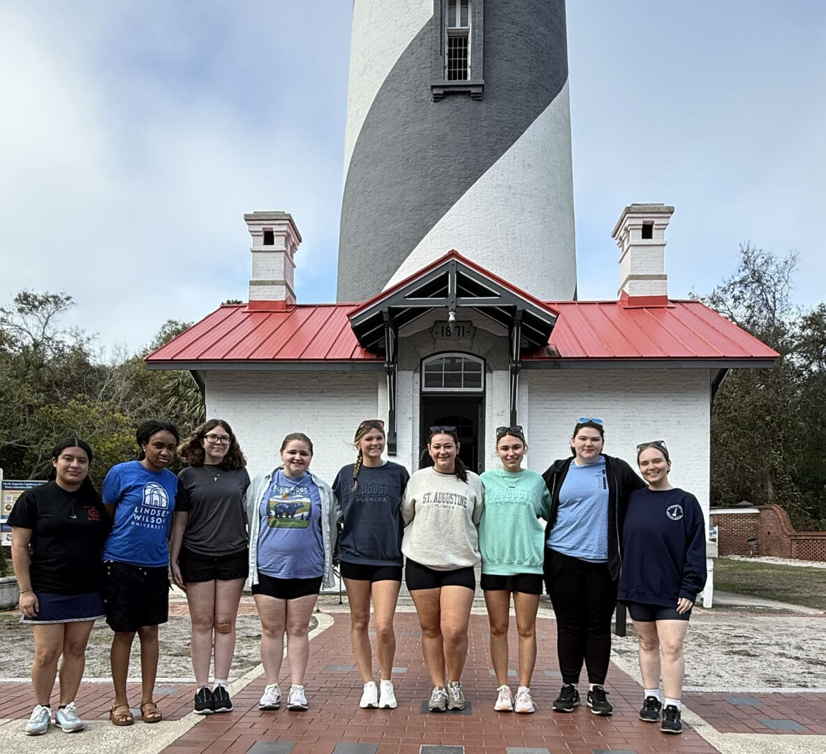 Members of the Lindsey Wilson University Bonner Scholar Program gather in front of the St. Augustine Lighthouse, one of three nonprofit organizations they worked with in northeast Florida during their service trip over spring break, March 2-6. Pictured, from left: Anahi Centeno-Mendoza ’29 of Russell Springs, Kentucky; Deborah Seth-Osehahumen ’29 of Lekki, Nigeria; Sabrina Anderson ’29 of Burkesville, Kentucky; Josephine Posey ’28 of Greensburg, Kentucky; Patience Anderson ’29 of Bowling Green, Kentucky; Megan Fowler ’29 of Bowling Green; Cecilia Hiatt ’29 of Maysville, Kentucky; Vivian Gemmill ’29 of Edmonton, Kentucky; and Lindsey Wilson Director of Civic Engagement, Student Leadership and the Bonner Scholar Program Kisha Burton ’13.