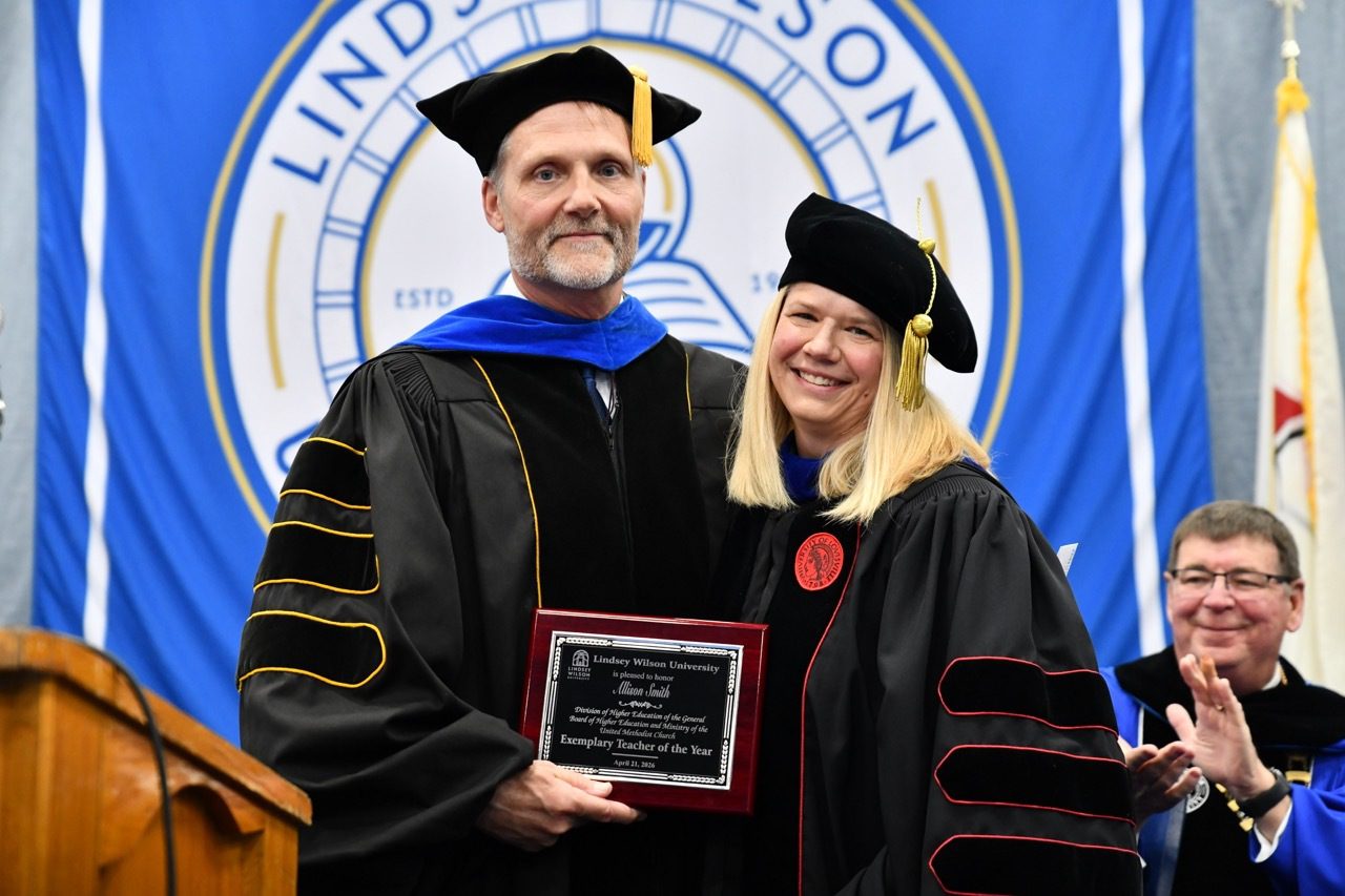 Lindsey Wilson University Vice President for Academic Affairs Ray Lutgring, left, presents the Exemplary Teacher Award from The United Methodist Church Division of Higher Education to School of Arts and Humanities Dean Dr. Allison Smith at the university’s annual Honors Convocation, held Tuesday, April 21, at Biggers Sports Center.