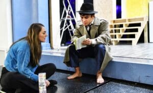 Gabriella Devore ’26 (Susan Hendrix) of Knob Lick, Kentucky, and Adrian Ayala (Sergeant Carlino), a graduate student from Naples, Florida, review lines for the upcoming production of “Wait Until Dark” by the Lindsey Wilson University Department of Theatre. The psychological thriller will be presented Nov. 19-21 and Nov. 23 at V.P. Henry Auditorium.