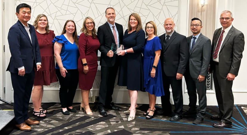 Members of the Lindsey Wilson University Education Program are presented the 2025 Frank Murray Leadership Recognition for Continuous Improvement by the Council for the Accreditation of Educator Preparation on Thursday, Sept. 18, in Arlington, Virginia. From left: CAEP representative Yuhang Rong; Robin Franklin, LWU education administrative assistant; Carlie Meece, LWU education faculty member; Jennie Shelpman, LWU academic affairs administrative assistant; Ray Lutgring, LWU vice president for academic affairs; Jennifer Antoniotti-Neal, LWU education program director; Lisa Newell-Hare, LWU education faculty member; Brennon Sapp, LWU education faculty member; Wonhee Lee, LWU education faculty member; and CAEP President Christopher Koch.