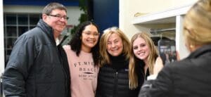 Lindsey Wilson University President William T. Luckey Jr. and First Lady Elise Luckey pose for a picture with students K’Asia Palmer ’27 of Owensboro, Kentucky, second from left, and Kaiden Rodgers ’28 of Paducah, Kentucky, at the university’s semiannual Midnight Breakfast on Tuesday, Dec. 9, in the Roberta D. Cranmer Dining & Conference Center.