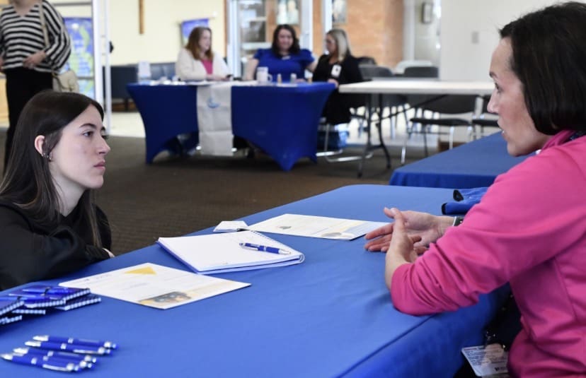 Lindsey Wilson University nursing student Kaylyn Smith ’26 of Campbellsville, Kentucky, left, speaks with Dana Meiklereid, senior recruiter with Norton Healthcare Human Resources of Louisville, Kentucky, at the LWU Nursing Fair, held Friday, Feb. 27, at the university’s Norma and Glen Hodge Center for Discipleship.