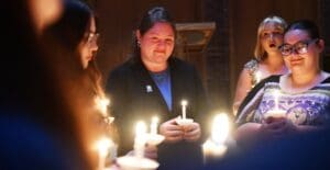 Lindsey Wilson University Singer Yesh Singayao ’27 of Vine Grove, Kentucky, holds a candle while standing against an interior wall of the John B. Begley Chapel during the Singers’ Standards of Excellence Signing Ceremony, held Tuesday, Sept. 23.