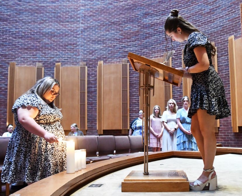 New Lindsey Wilson University Singer Gracie Thurman ’29 of Owensboro, Kentucky, left, lights a candle while fellow new member Brinkley Todd ’29 of Louisville, Kentucky, signs the group’s “Standards of Excellence” on Tuesday, Sept. 23, in the university’s John B. Begley Chapel.