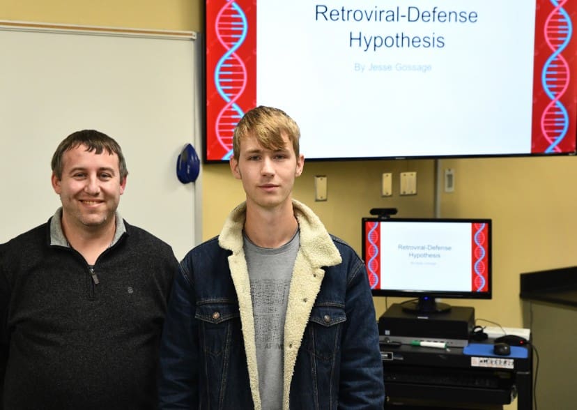 Lindsey Wilson University student Jesse Gossage ’26 of Russell Springs, Kentucky, right, presented “Retroviral-Defense Hypothesis,” which he developed while studying under chemistry professor Andrew Johnson. Gossage presented his research in the Jim & Helen Fugitte Science Center during Lindsey Wilson’s 2025 fall semester Academic Celebration Week.