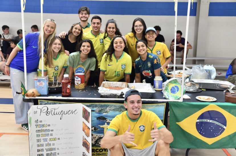 The Brazil booth was named as having the top cuisine by patrons who attended the Lindsey Wilson University International Marketplace, held Thursday, April 2, in the university’s Doris and Bob Holloway Health & Wellness Center. Pictured, front: Niccolas Souza ’27 of Tijucas, Brazil. Second row, from left: Lindsay Cox ’26 of London, Kentucky; Amanda Parreiras Goncalves ’26 of Belo Horizonte, Brazil; Lara Giovana Rocha ’28 of Sete Lagoas, Brazil; and Julia Dos Santos ’28 of Salto, Brazil. Third row, from left: Gabriela Zuquelo ’26 of Chopinzinho, Brazil; Vitoria Loiola ’26 of Brasilia, Brazil; Dan Dos Reis Spinola ’28 of Salvador, Brazil; Lara Reis ’29 of Belo Horizonte, Brazil; Maria Eduarda Becho ’28 of Belo Horizonte, Brazil; and Lara Moraes Lima Dorea ’29 of Salvador, Brazil. Back: Filipe Polini ’29 of Sinop Mato Grosso, Brazil.