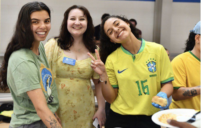Lindsey Wilson University International Student Affairs Communications and Global Student Support Coordinator Makayla M. Wright ’24 is joined by students Amanda Parreiras Goncalves ’26 of Belo Horizonte, Brazil, left, and Lara Giovana Rocha ’28 of Sete Lagoas, Brazil, during the Lindsey Wilson International Marketplace on Thursday, April 2, in the university’s Doris and Bob Holloway Health & Wellness Center.