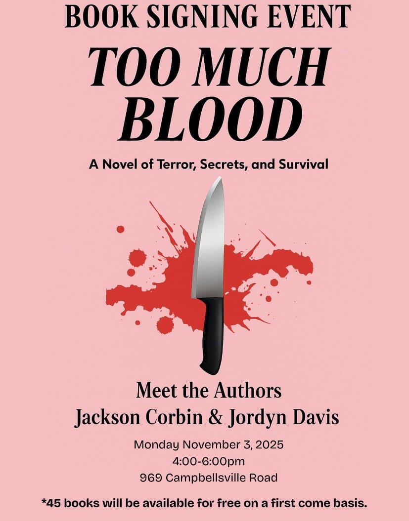 Adair County Adult Education is hosting a book signing for “Too Much Blood” written by local students Jackson Corbin and Jordyn Davis.