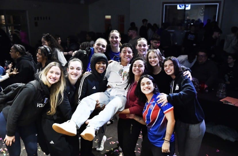 Lindsey Wilson University student Lara Moraes Lima Dorea ’29 of Salvador, Brazil, center, celebrates with friends after finishing in second place of the 2026 “Lindsey Idol” on Thursday, Feb. 26, in the university’s Norma and Glen Hodge Center for Discipleship.