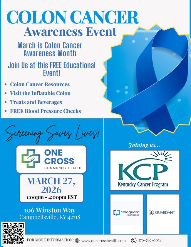 In recognition of March as Colon Cancer Awareness Month, One Cross Health will host a free educational event on March 27 from 1:00 p.m. to 4:00 p.m. EST at its facility located at 106 Winston Way in Campbellsville.