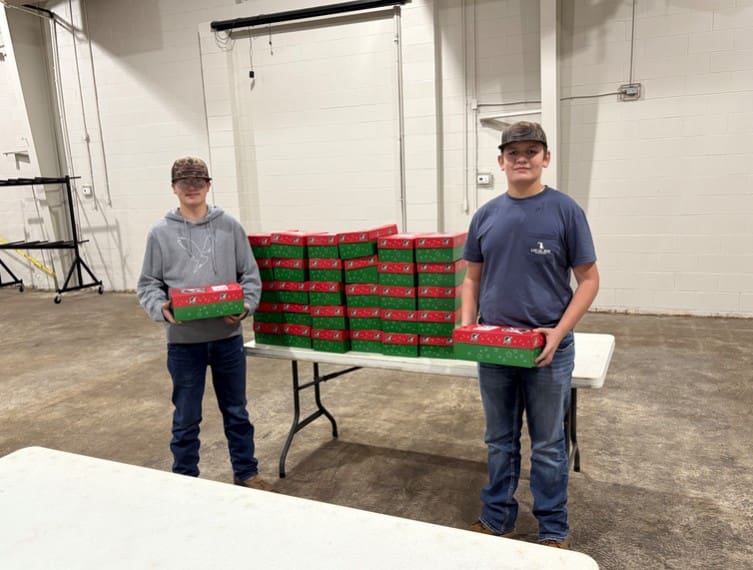 Knifley Christian Church is always one of the first to drop off shoebox gifts at the drop off location which is located at the Wheet Fellowship Hall, 1200 Jamestown St., Columbia, KY. Pictured are Jace Cole and Dierks Cowan with the beautiful shoeboxes that were prepared by the Knifley Christian Church.