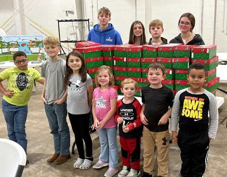 The children and youth from the Creekbend Community Church delivered shoebox gifts to the Wheet Fellowship Hall on Wednesday evening. Pictured are front row from left: Zavion Logsdon, Colton Irvin, Kailyn Irvin, Naom Spoon, Rhett Wood, Ezra Spoon, and Zekiah Hendricks. Standing from left are Bryson Hadley, Karlie Irvin, Caleb Robertson and Anna Beth Sharp.