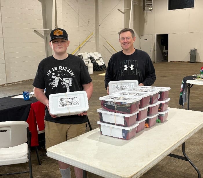 Kasey Blue Kessler dropped off shoebox gifts for the 14th straight year. For each year Kasey gets older he adds one more box so now he’s 14 years of age. Pictured with him is his dad Eddie Kessler. The Kessler’s track their boxes and have had boxes go to the countries of Columbia, Madagascar, and a French province in South Africa among other places.