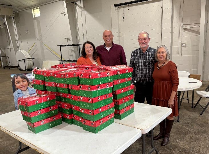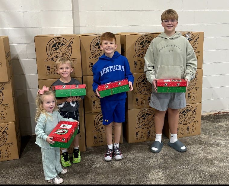 The final drop off of the day on Sunday was made by the Glens Fork Church of the Nazarene. This year they packed a record number of boxes. They brought in several cartons of boxes in addition to the ones that the children are holding. Marlee Fudge, Tate Fudge, Jagger Collins, and Nash Collins. Grandparents Jerry and Lee Ann Collins brought their grandchildren by to drop off their beautiful boxes.