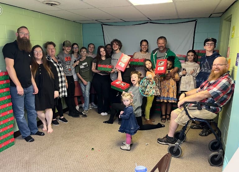 The Rheber Nazarene Church in Casey County has delivered shoebox gifts to the Wheet Fellowship Hall for the past 15 years. Pictured with their beautiful boxes is Anna Huff.