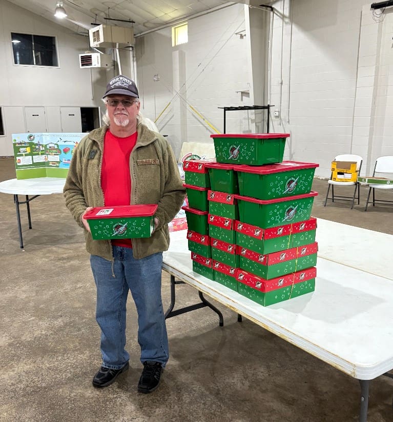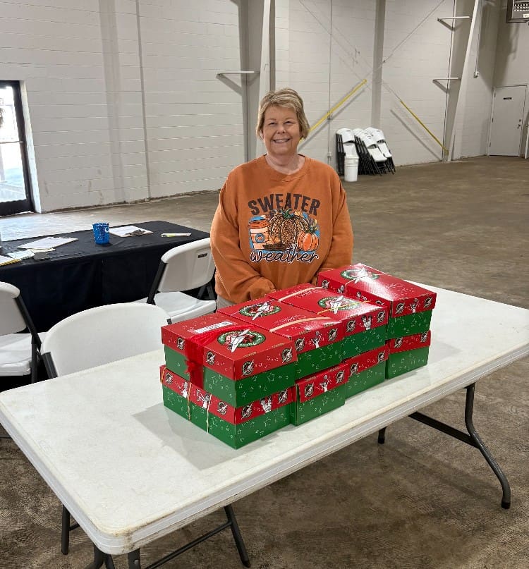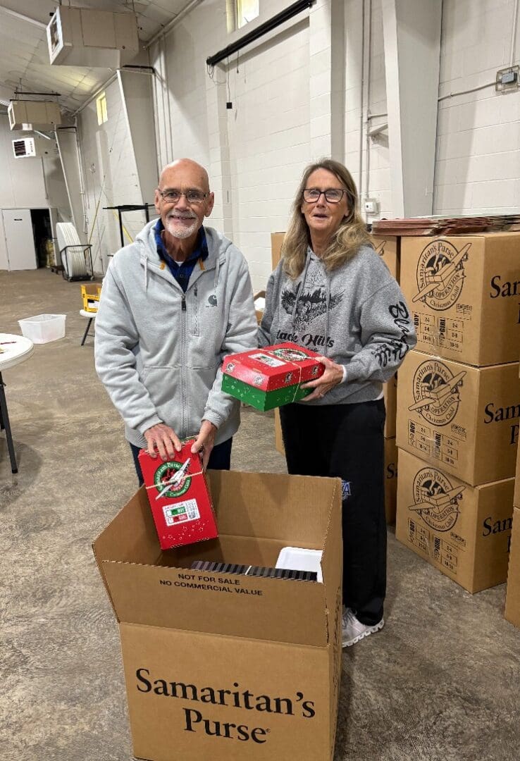 Packing the final two shoebox gifts of the 2025 national collection week campaign were Kerry and Terrie Radford. These boxes were turned in by the Columbia Baptist Church bringing their total to 1250 boxes and the Adair County total to 3667 shoebox gifts.