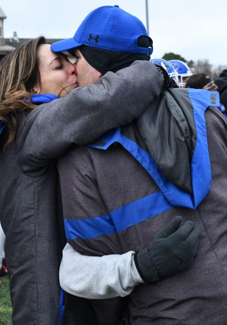 Lindsey Wilson University football coach Phil Kleckler is congratulated by his wife, Randi, and son, Rory, following the Blue Raiders’ 57-31 win over Indiana Wesleyan University in the second round of the NAIA Football Championship Series on Saturday, Nov. 29, at Parnell Family Stadium. No. 7-ranked Lindsey Wilson advanced to the quarterfinals round against top-ranked Grand View (Iowa) University on Saturday, Dec. 6, in Des Moines, Iowa.