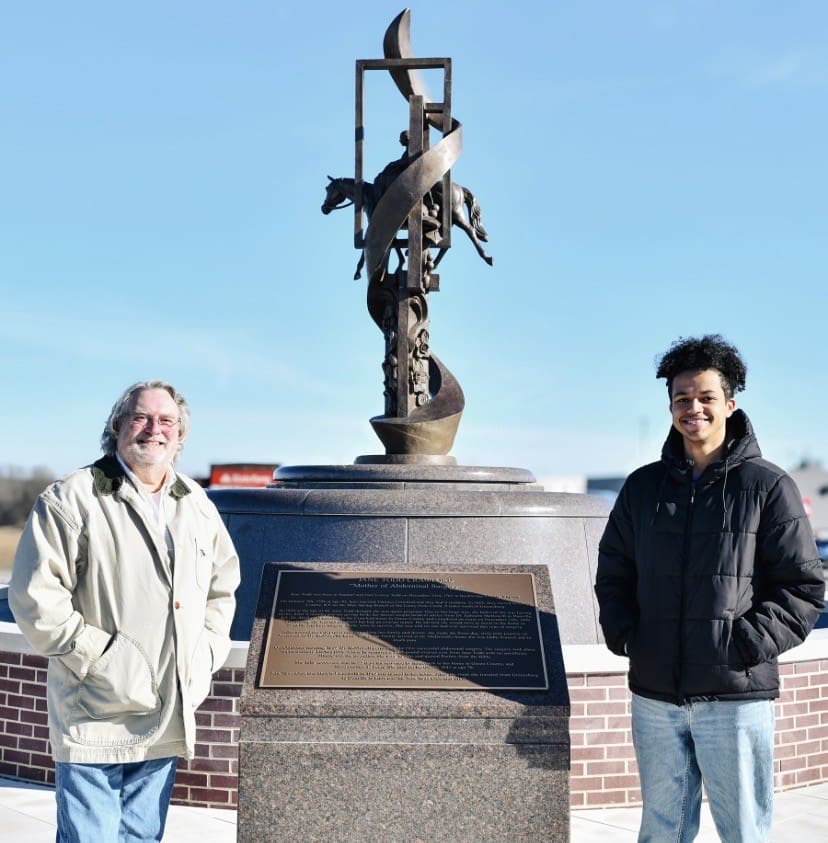 Lindsey Wilson University art professor Tim Smith, left, and art major Tezon Mitchell ’27 of Greensburg, Kentucky, stand Monday, Dec. 15, next to the sculpture of Jane Todd Crawford in front of Jane Todd Crawford Hospital in Greensburg. The sculpture was unveiled Dec. 13. Smith created the sculpture, and Mitchell was one of the LWU students who assisted him on the project.