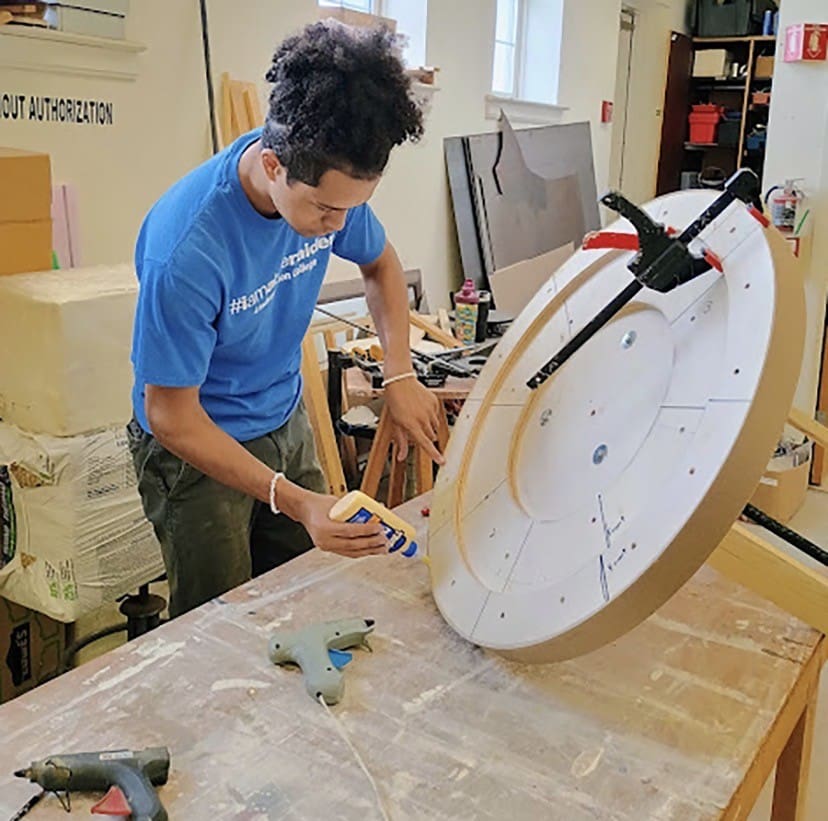 Lindsey Wilson University art major Tezon Mitchell ’27 of Greensburg, Kentucky, works on the Jane Todd Crawford sculpture earlier this year in the university’s W.W. Slider Humanities Center art studio.