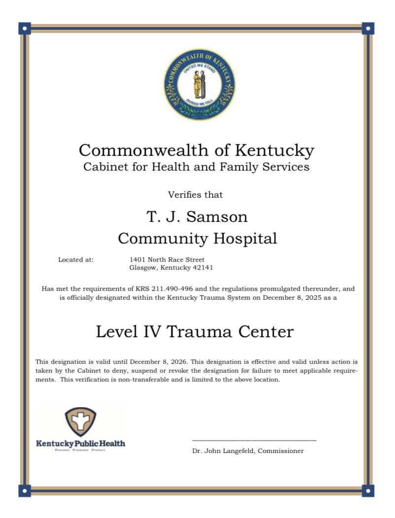 Glasgow, KY – T.J. Regional Health proudly announces that T.J. Samson Community Hospital and T.J. Health Columbia have each been officially designated as Level IV Trauma Centers, marking a historic milestone as the first trauma-designated hospitals in South Central Kentucky.