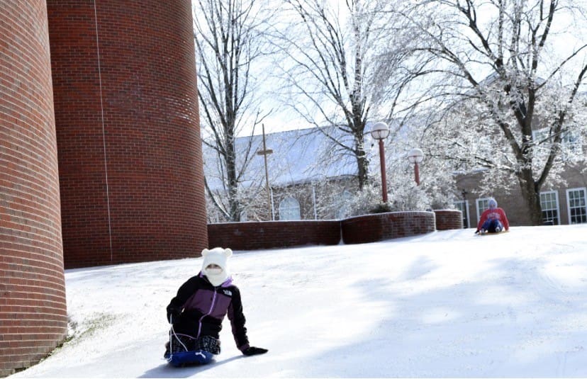 In addition to experiencing snow for the first time, some Lindsey Wilson students also experienced a school tradition for the first time — sledding down the hill behind Keefe Hall, which runs behind the west goal of Walter S. Reuling Stadium. In the early fall, a water slide is held on the steep hill during Malvina Farkle Day, the university’s annual day of service.