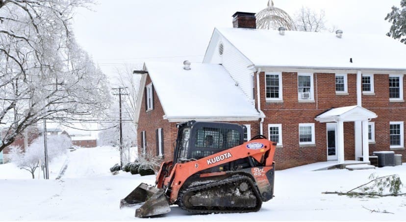 Travis Brown of Lindsey Wilson University Physical Plant Operations clears the parking lot behind the university’s R.B. Fenley Building on Monday, Jan. 26. The weekend’s winter storm closed Lindsey Wilson offices and canceled classes on Monday, but the university’s physical plant staff members worked throughout the weekend to keep campus sidewalks and parking lots clear for students living on campus.